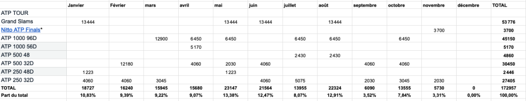 | ATP TOUR | Nombre de tournois | Nombre de points distribués par tournois | TOTAL |